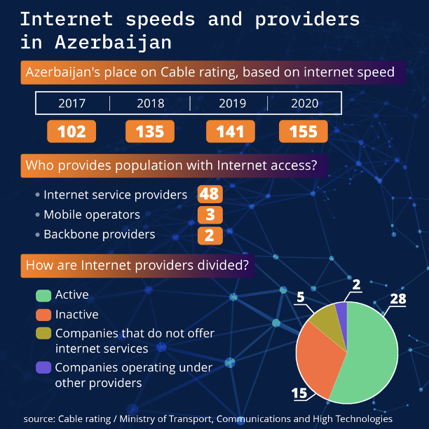 In total, the country has 48 ISPs, 3 mobile operators (Azercell, Bakcell, and Azerfon/Nar Mobile) and as mentioned above, two backbone internet providers (See infographic 1).