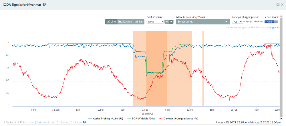 Source: Internet Outage Detection and Analysis (IODA), IODA Signals for Myanmar, https://ioda.caida.org/ioda/dashboard#view=inspect&entity=country/MM&lastView=overview&from=1612051200&until=1612224000