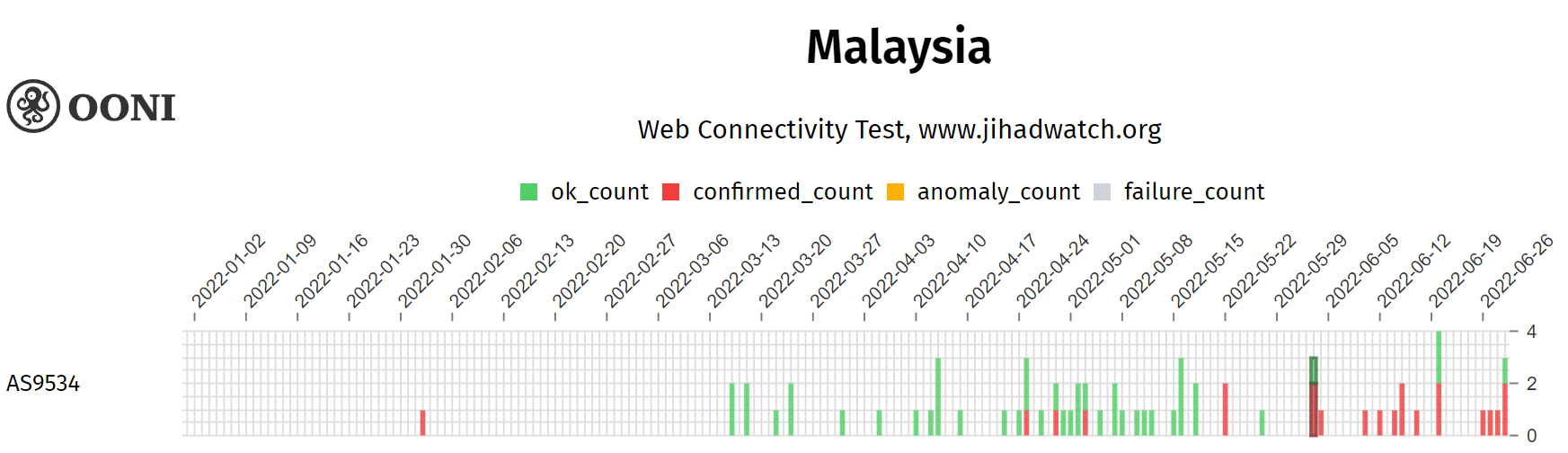 Jihad Watch was first detected to be blocked on 2 February 2022 by AS9534 Maxis Broadband. The website was sparingly tested and found to be accessible after that in the same network from 16 March to 27 May 2022, with instances of blocking found on 25 April, 29 April, 3 May, 22 May. Measurements collected from 3 June onwards to the end of coverage period show a mixed of confirmed blockings and accessible counts, as shown in the graph below: