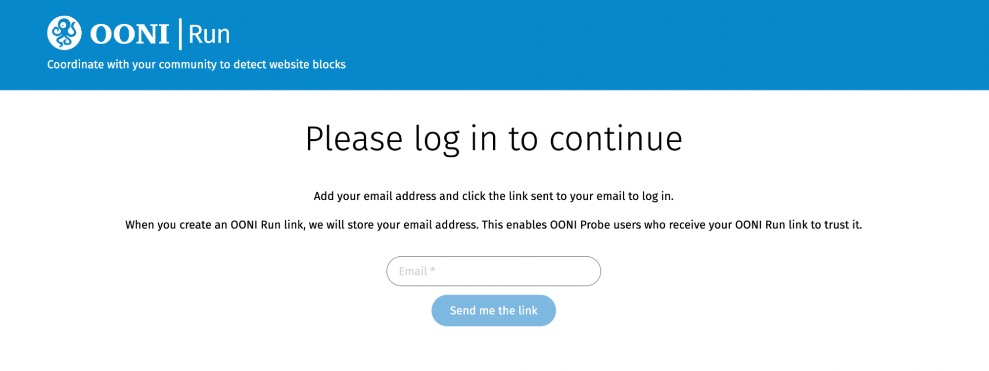 Note: We do not store email addresses when you log in, but only when you create an OONI Run link. We store your email address so that when OONI Probe users receive an OONI Run link from you, they can trust it based on your email address (which is displayed in the OONI Run link you create). This can help reduce the risk of running malicious links.