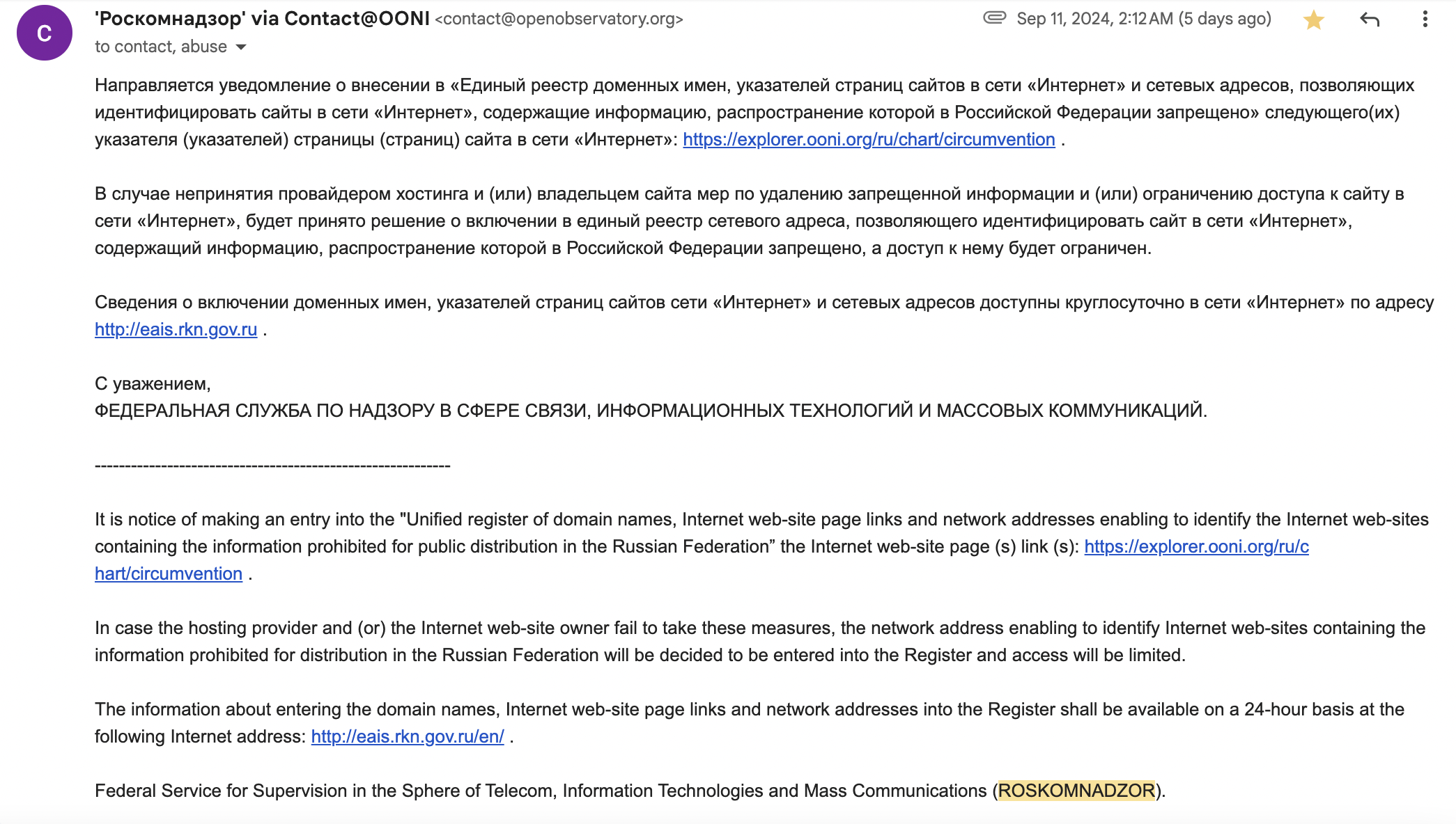 Image: Email sent from Roskomnadzor to OONI providing a notification on the blocking of OONI Explorer.