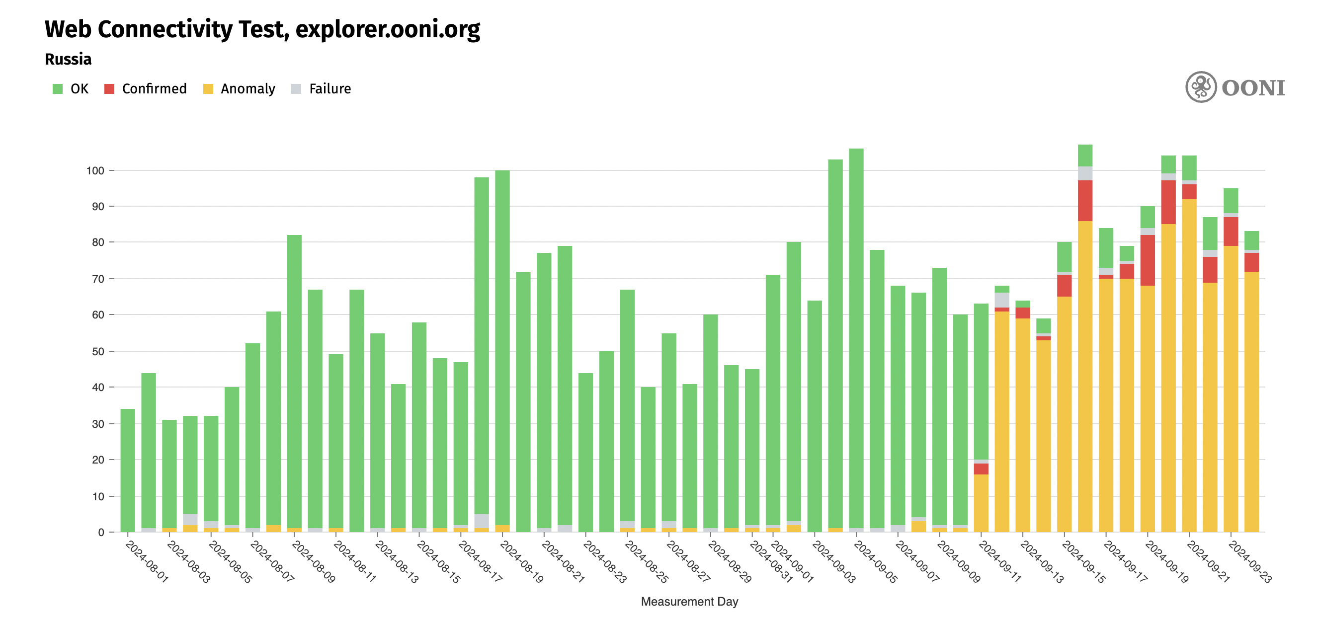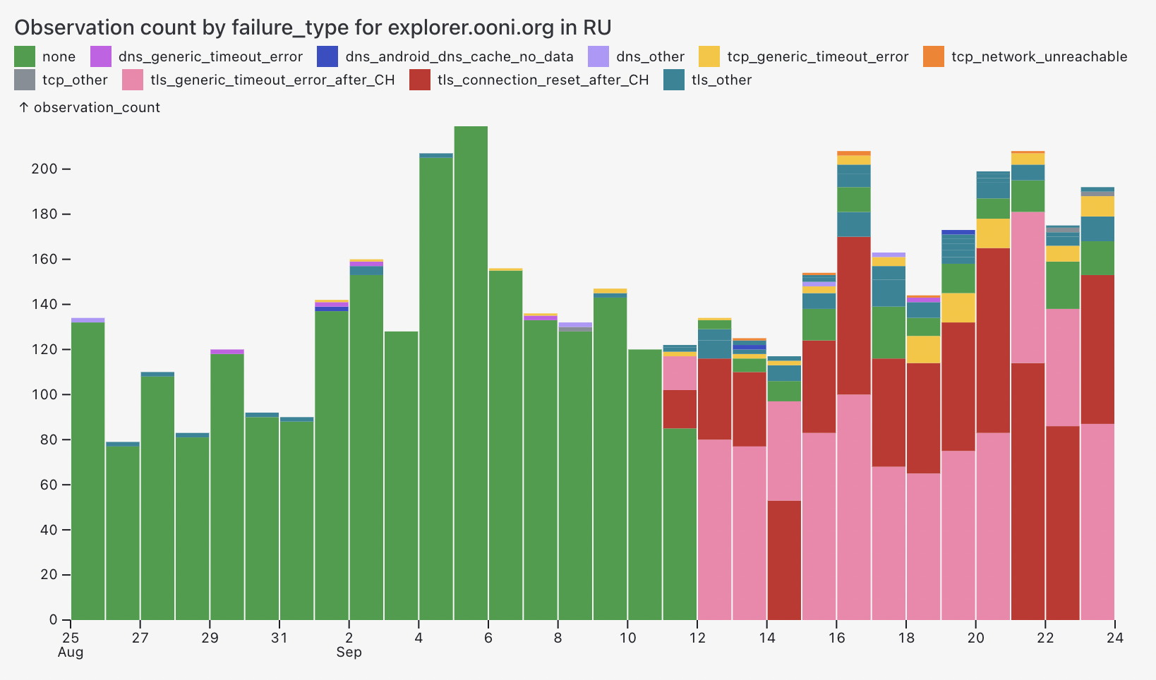 Chart: Annotation of failure types and errors in OONI measurements from the OONI Probe testing of OONI Explorer (explorer.ooni.org) in Russia between 25th August 2024 to 24th September 2024 (source: OONI data).