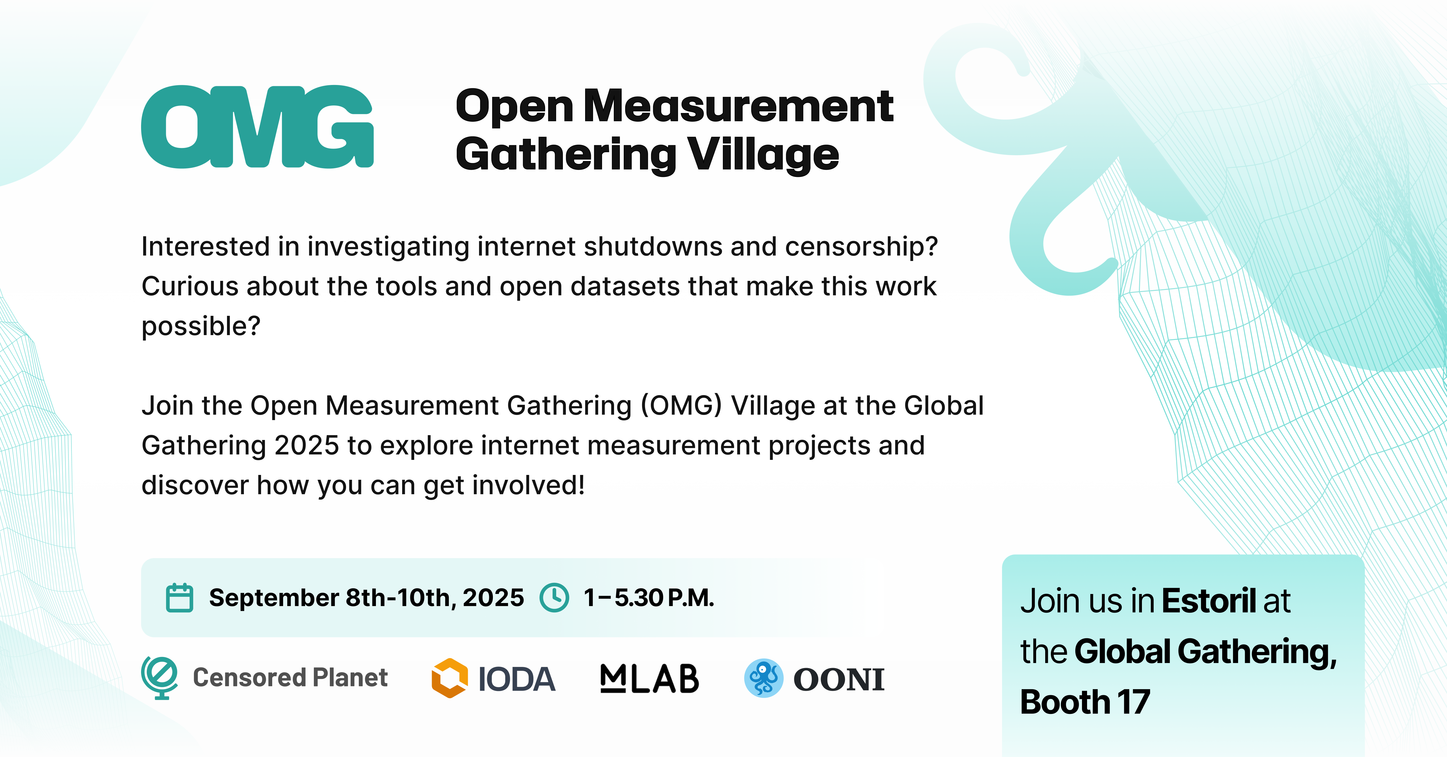 Join us at the Global Gathering Open Measurement Gathering (OMG) Village: a community space organized and hosted by 4 internet measurement projects: Open Observatory of Network Interference (OONI), Measurement Lab (M-Lab), Internet Outage Detection & Analysis (IODA), and Censored Planet. We also have the pleasure of being joined by our friends Netalitica and Project Ainita, who will each host a booth on Day 3.