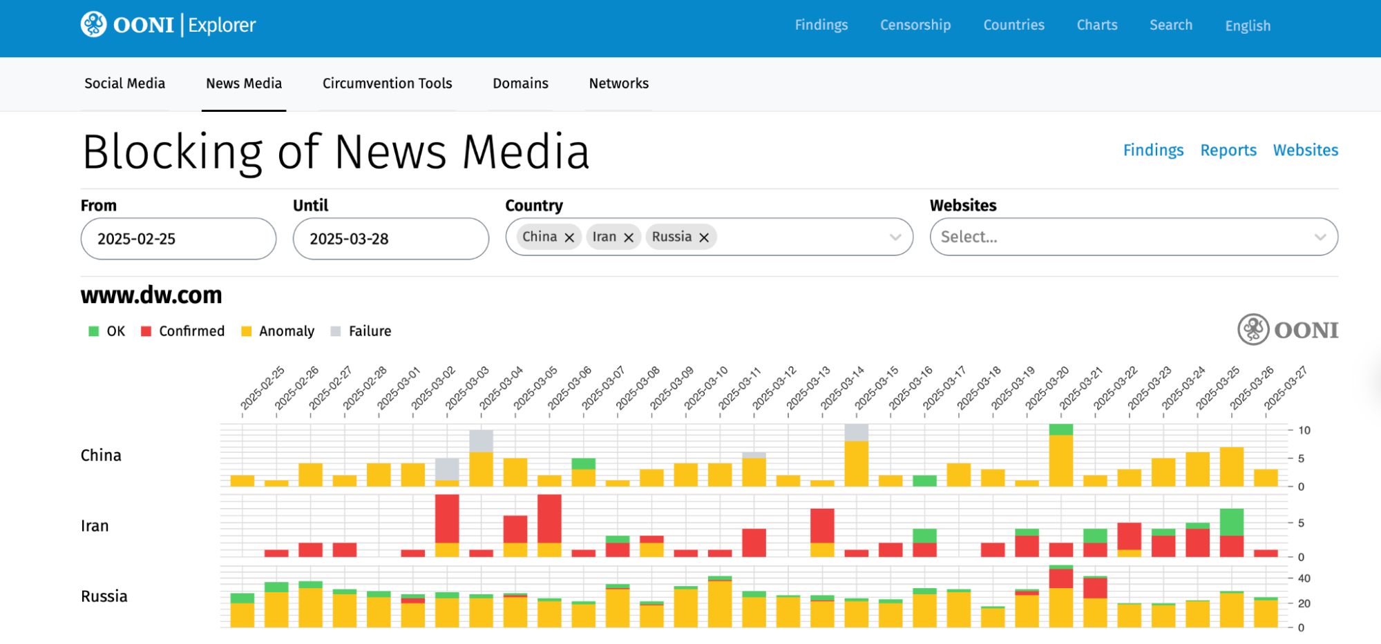 By default, these charts are filtered based on 3 countries: China, Iran, and Russia. We chose those countries because they have stable OONI measurement coverage and high levels of internet censorship, providing an opportunity to present more interesting charts (in comparison to other countries). OONI measurement coverage is available for most countries, and you can adjust the charts in these pages by changing the countries and date range (which is set to the past month by default). To better understand the charts, please refer to our documentation on interpreting OONI data.
