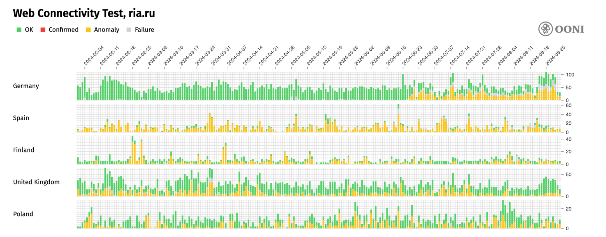 - Цензурная борьба между Россией и ЕС. После решения Совета Европы от 2022 года многие страны ЕС продолжают блокировать доступ к Sputnik и Russia Today (RT). После того как в мае 2024 года Совет Европы принял решение о приостановке вещания еще 4 связанных с Россией СМИ, в июне 2024 года Министерство иностранных дел России объявило об ограничении доступа к 81 СМИ стран-членов ЕС (включая несколько сайтов общеевропейских СМИ) на территории России. По данным OONI, доступ к сайтам этих новостных СМИ ЕС блокируется в России со 2 августа 2024 года.