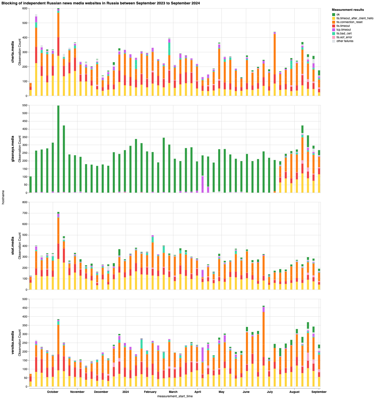 В частности, чтобы выяснить, какие сайты независимых российских новостных СМИ блокируются в России и какие методы цензуры применяют интернет-провайдеры, мы проанализировали данные сетевых измерений OONI, собранные в России за последний год (с 1 сентября 2023 года по 1 сентября 2024 года). Чтобы изучить влияние этих блокировок, мы опросили 15 независимых российских новостных СМИ. Мы также проанализировали список сайтов Citizen Lab для России и обновили его, включив в него дополнительные сайты независимых российских новостных СМИ для тестирования OONI Probe. Более подробная информация представлена ниже.
